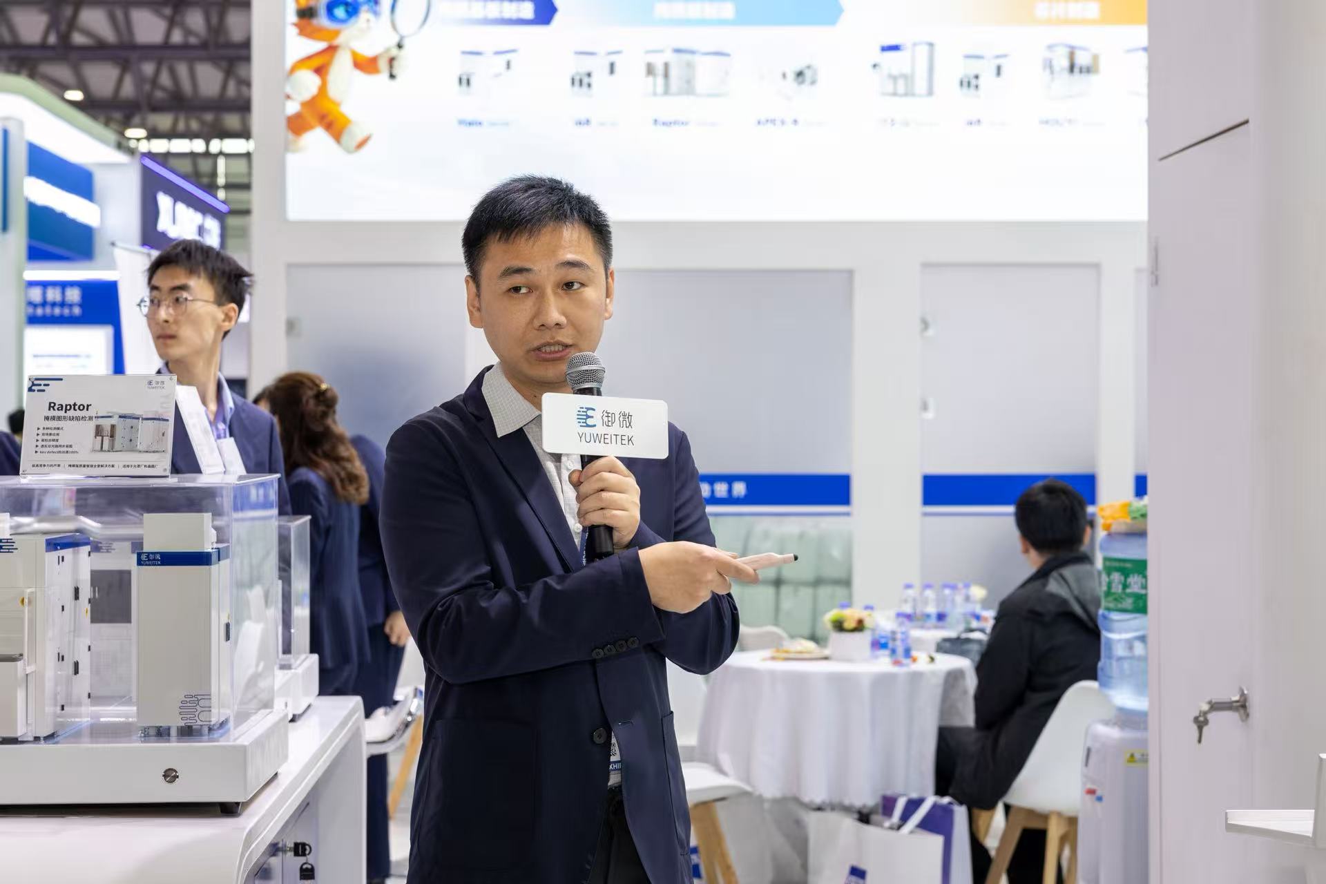 开展首日,御微展台迎来众多专业观众。模型区内,工程师围绕六款核心设备进行讲解;洽谈区内,销售团队与客户交流产线需求;前台咨询处,参观者有序扫码、领取资料。